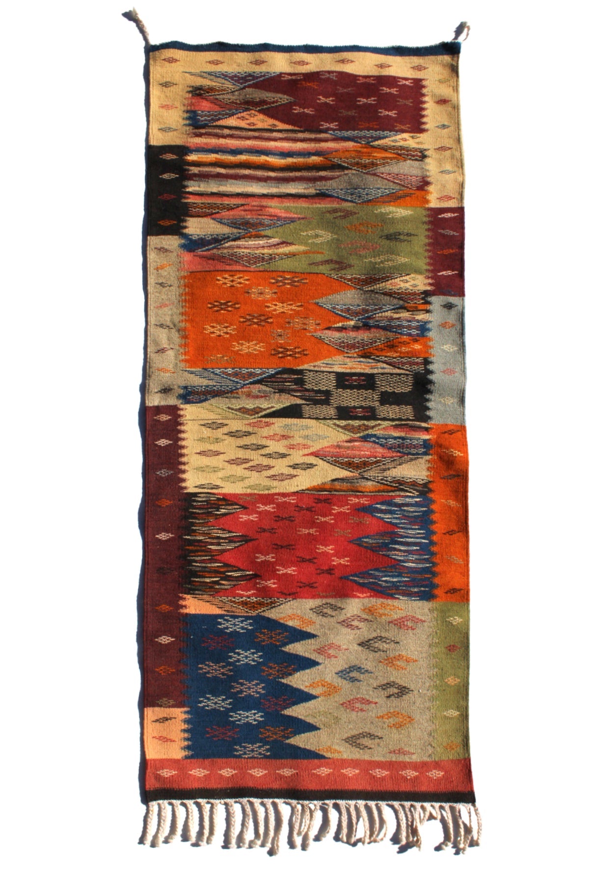 Authentic Moroccan Berber Kilim Rug Picasso Taznakht T63. Handmade tribal rug, expertly woven with traditional craftsmanship 150x60 cm