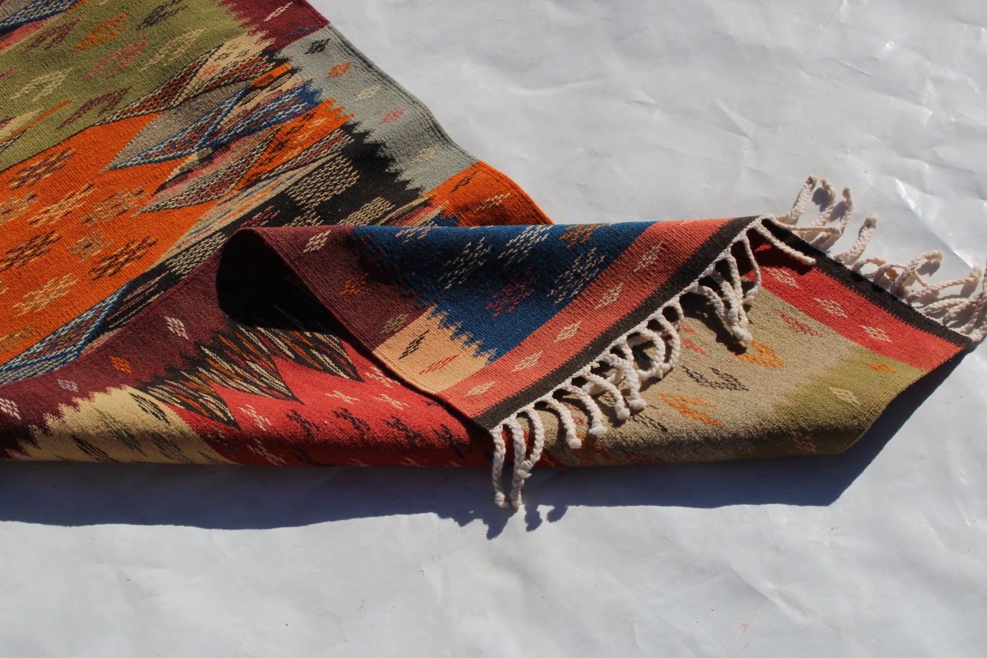 **Technique:** Handwoven using traditional Kilim methods for a flat, lightweight texture.
