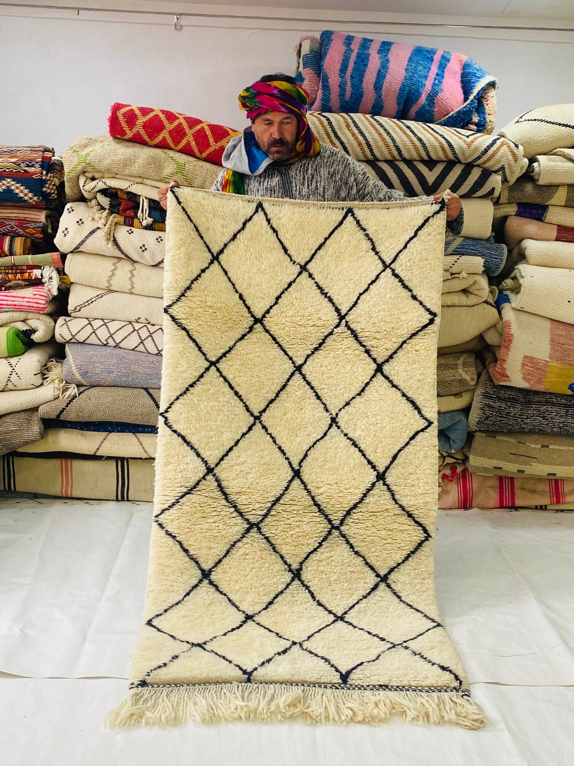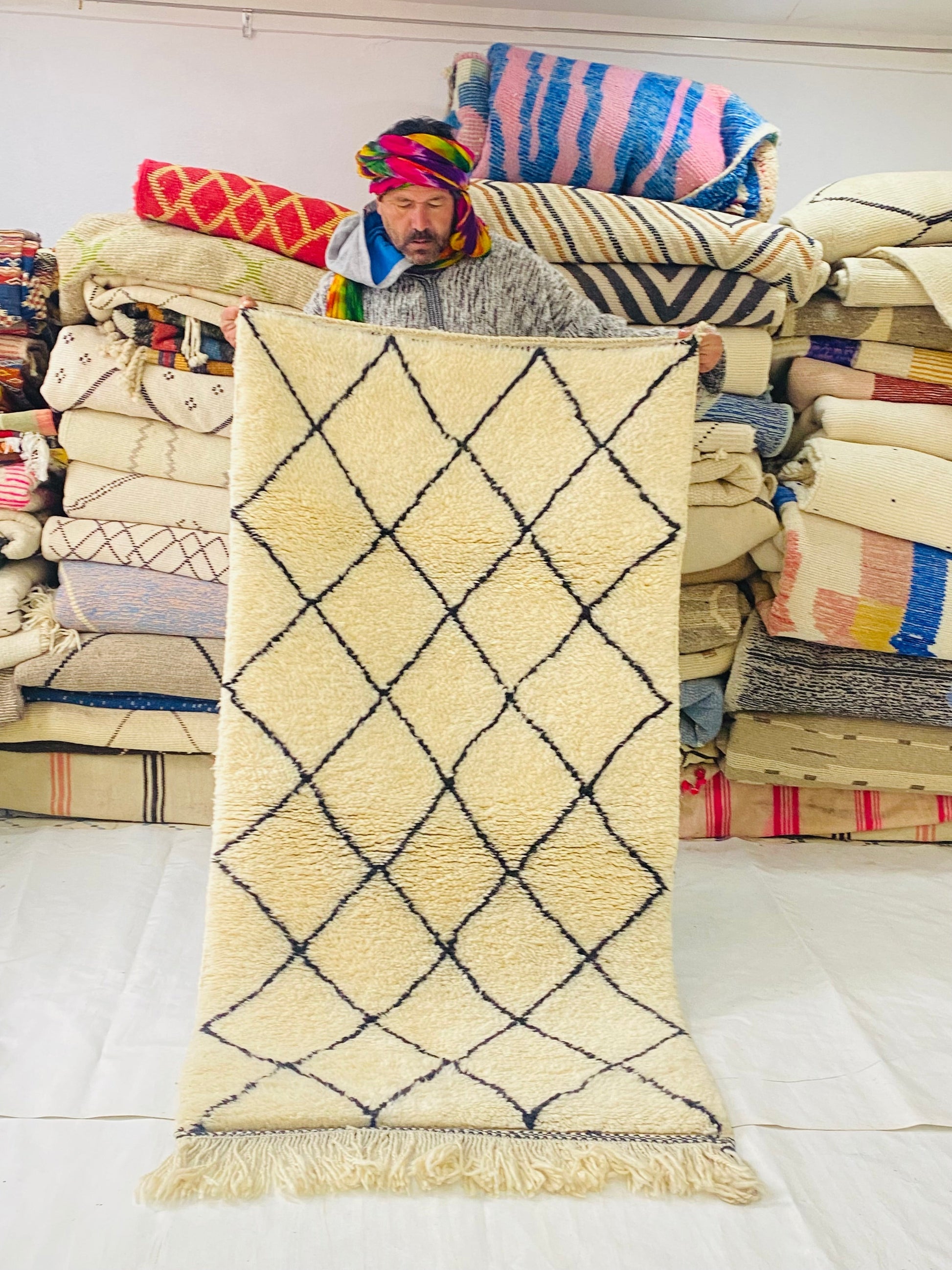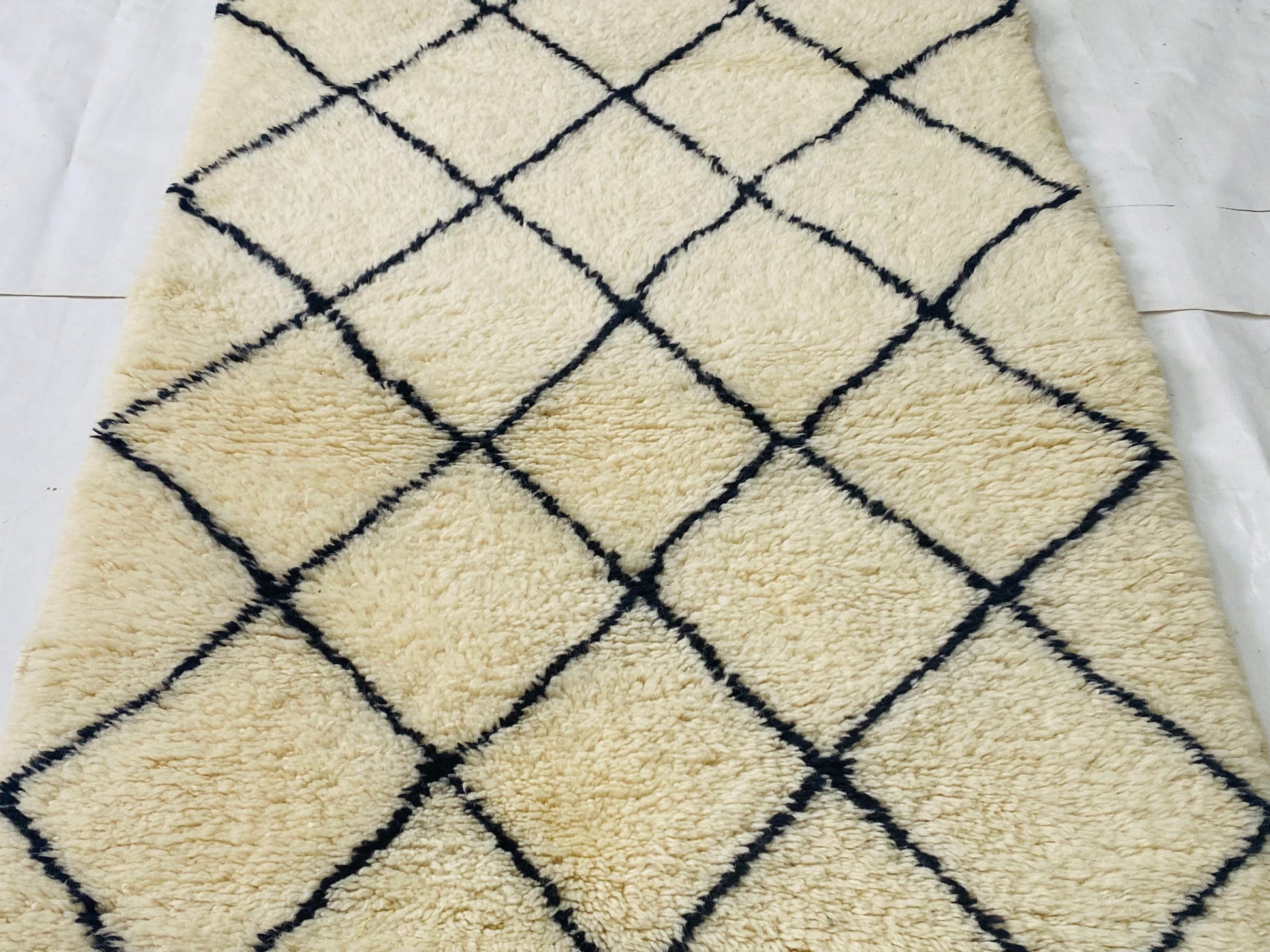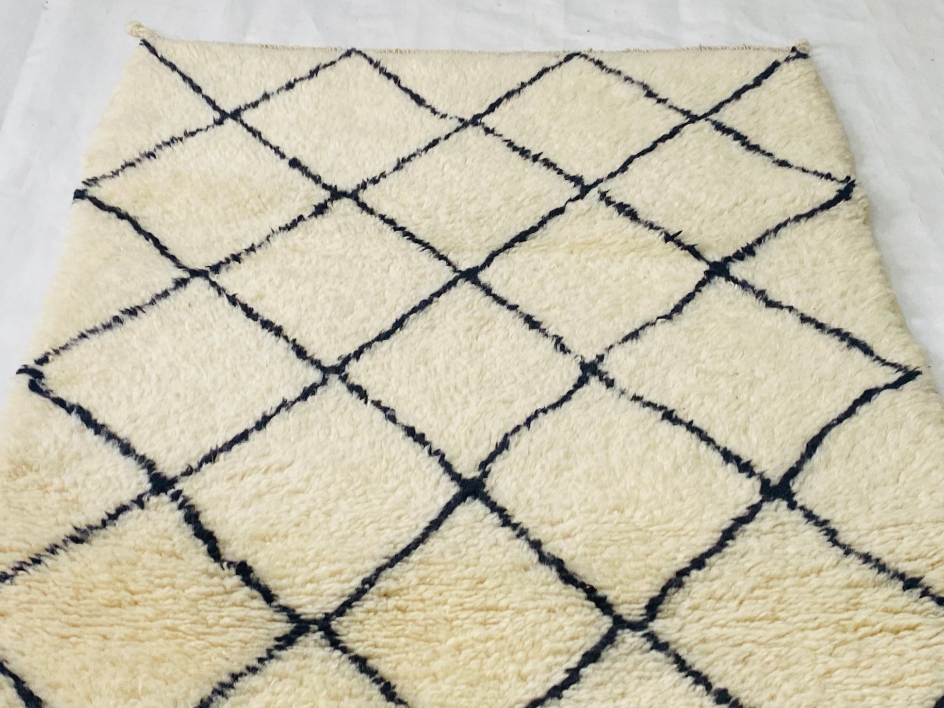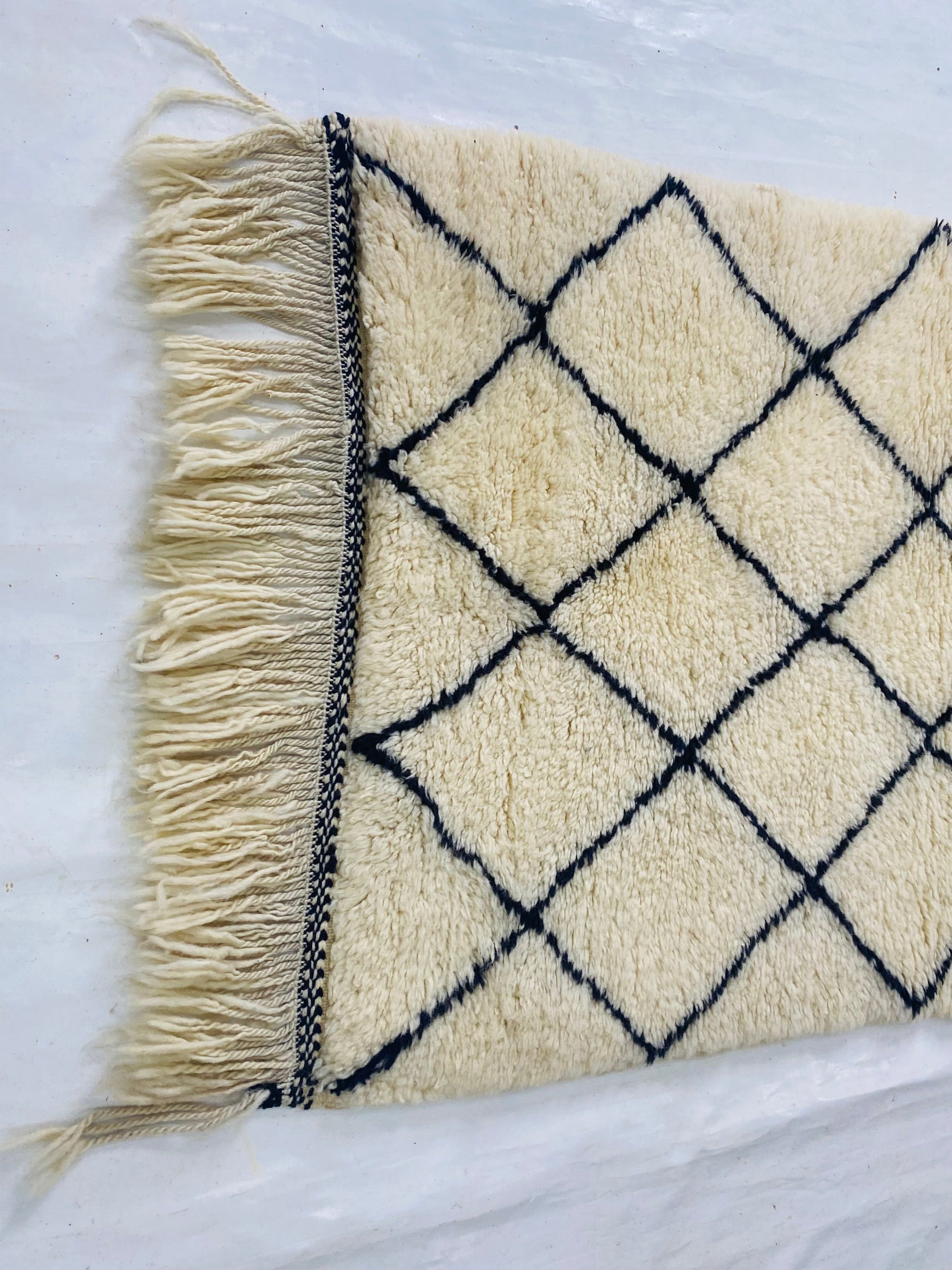 This Beni ourain rug is a Moroccan handmade rug, made between the middle Atlas and the Atlantic ocean of Morocco. Women in that region employed soft sheep wool and furnished it perfectly with wide diamonds shapes and tiny perfect details.