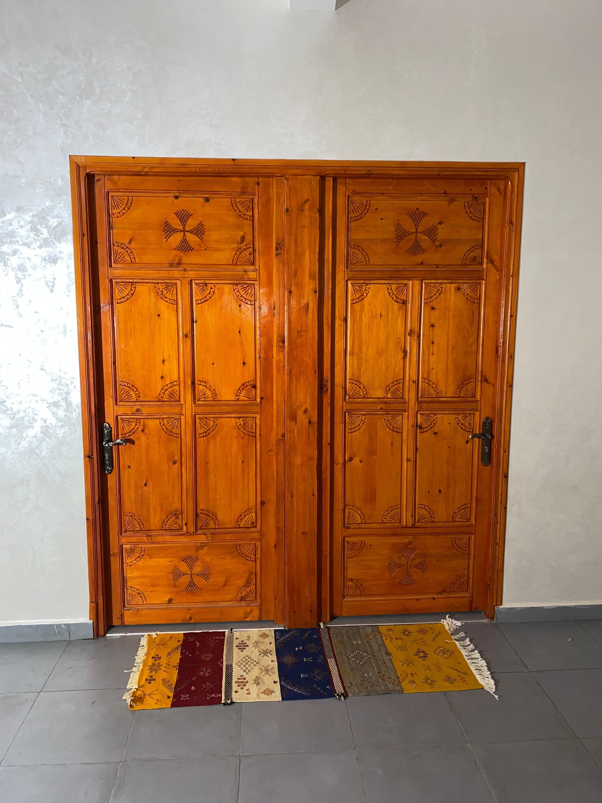 A Berber kilim is a traditional flat-woven carpet or rug created by the Berber people of North Africa, particularly in regions like Morocco. These kilims often feature geometric patterns and symbols, reflecting the rich cultural heritage of the Berber tribes. They are known for their durability and unique designs, making them popular in both traditional and modern decor.