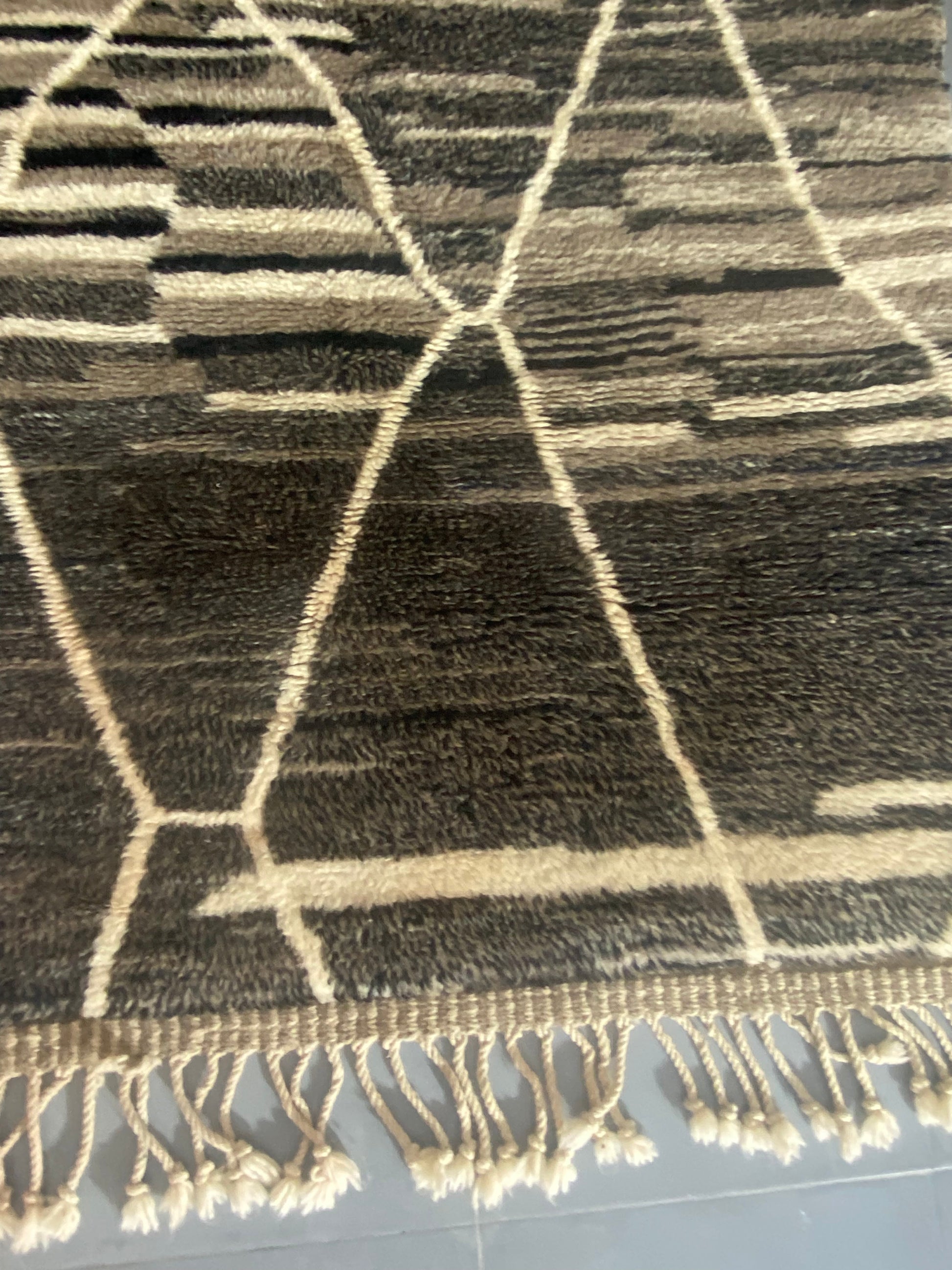 This Beni ourain rug is a Moroccan handmade rug, made between the middle Atlas and the Atlantic ocean of Morocco. Women in that region employed soft sheep wool and furnished it perfectly with wide diamonds shapes and tiny perfect details.