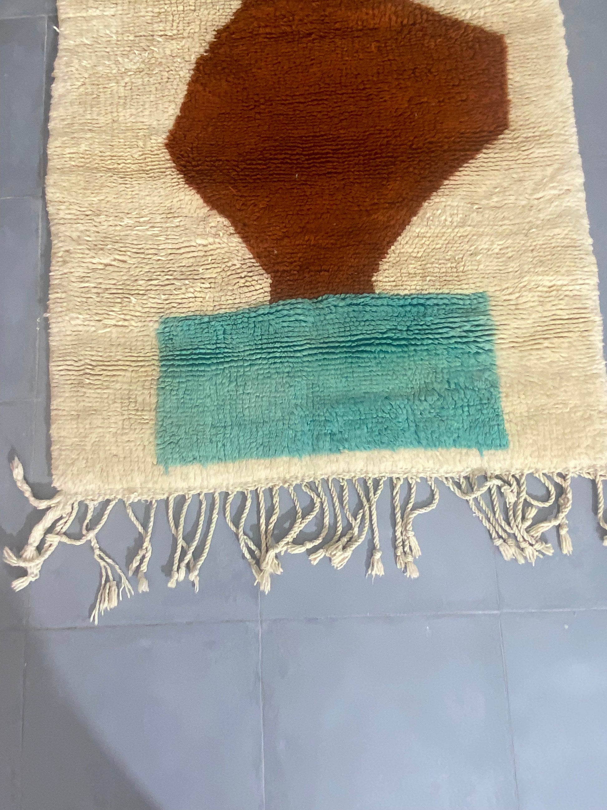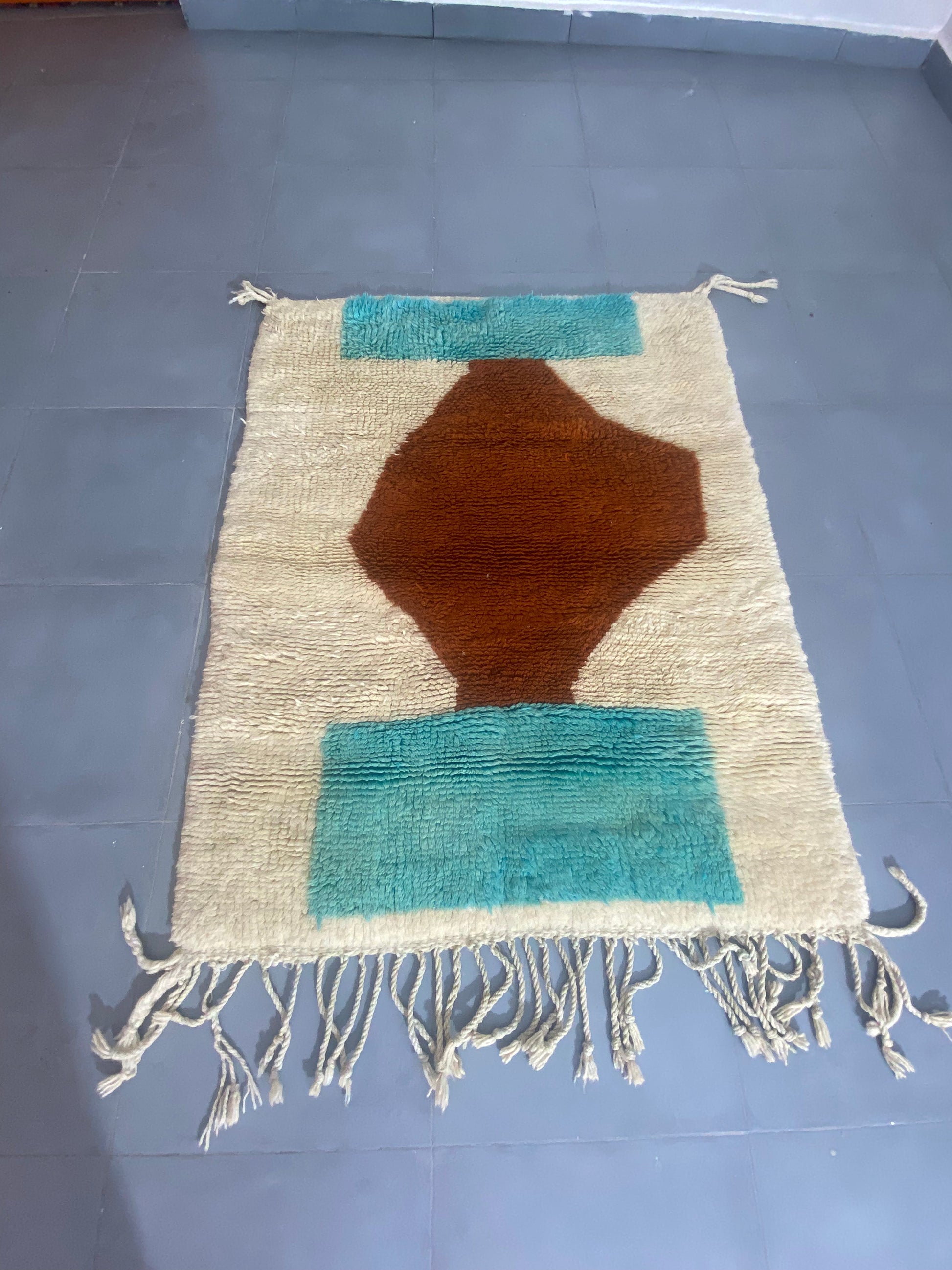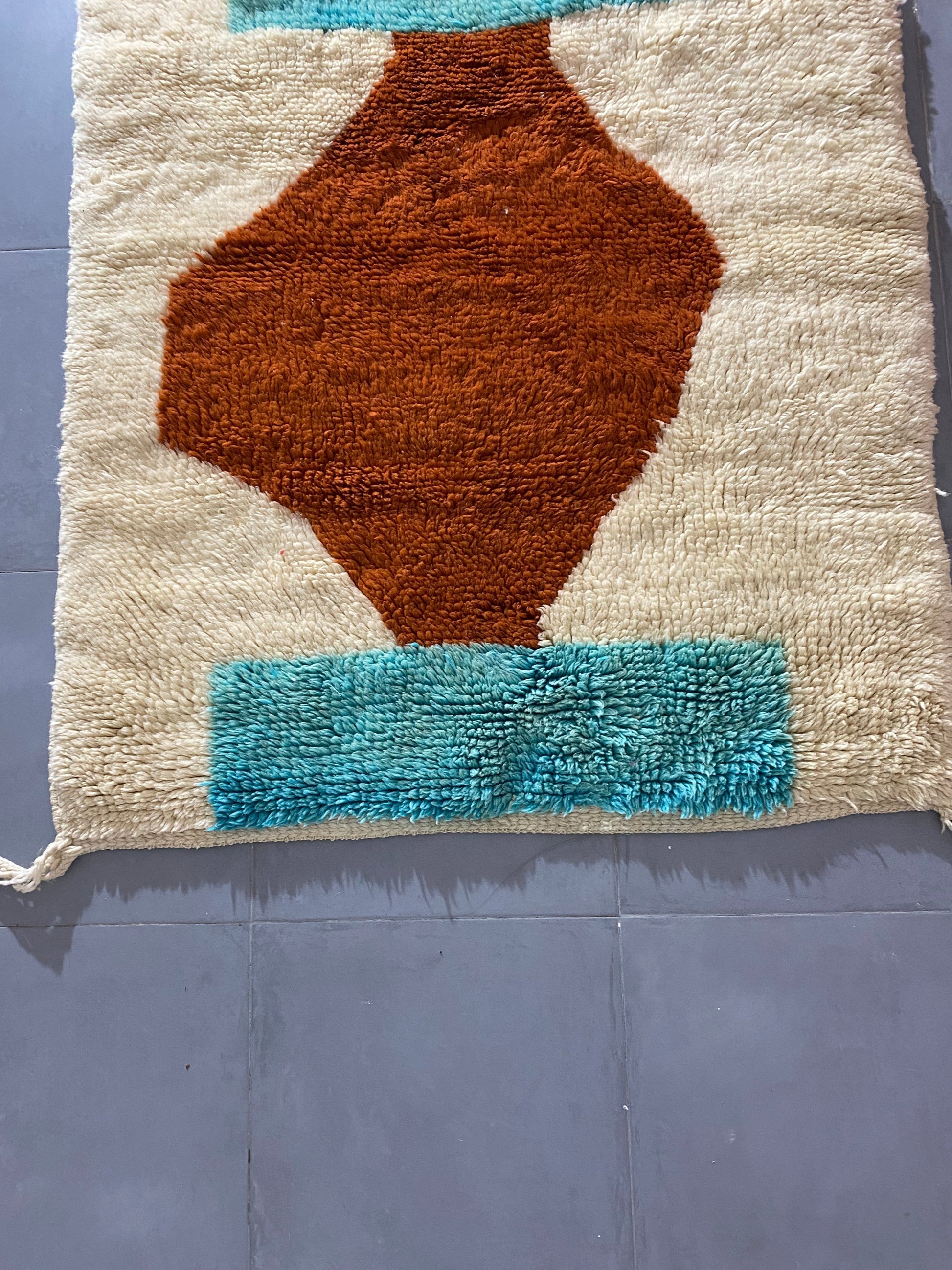 This Beni ourain rug is a Moroccan handmade rug, made between the middle Atlas and the Atlantic ocean of Morocco. Women in that region employed soft sheep wool and furnished it perfectly with wide diamonds shapes and tiny perfect details.