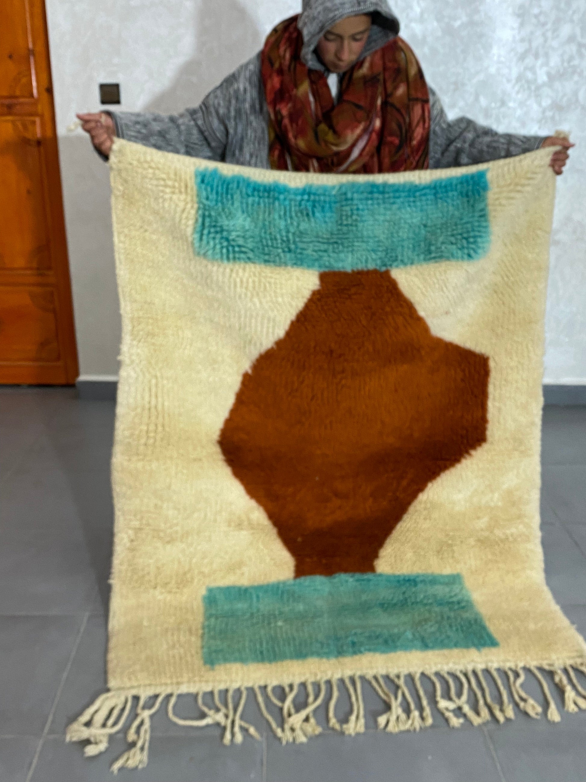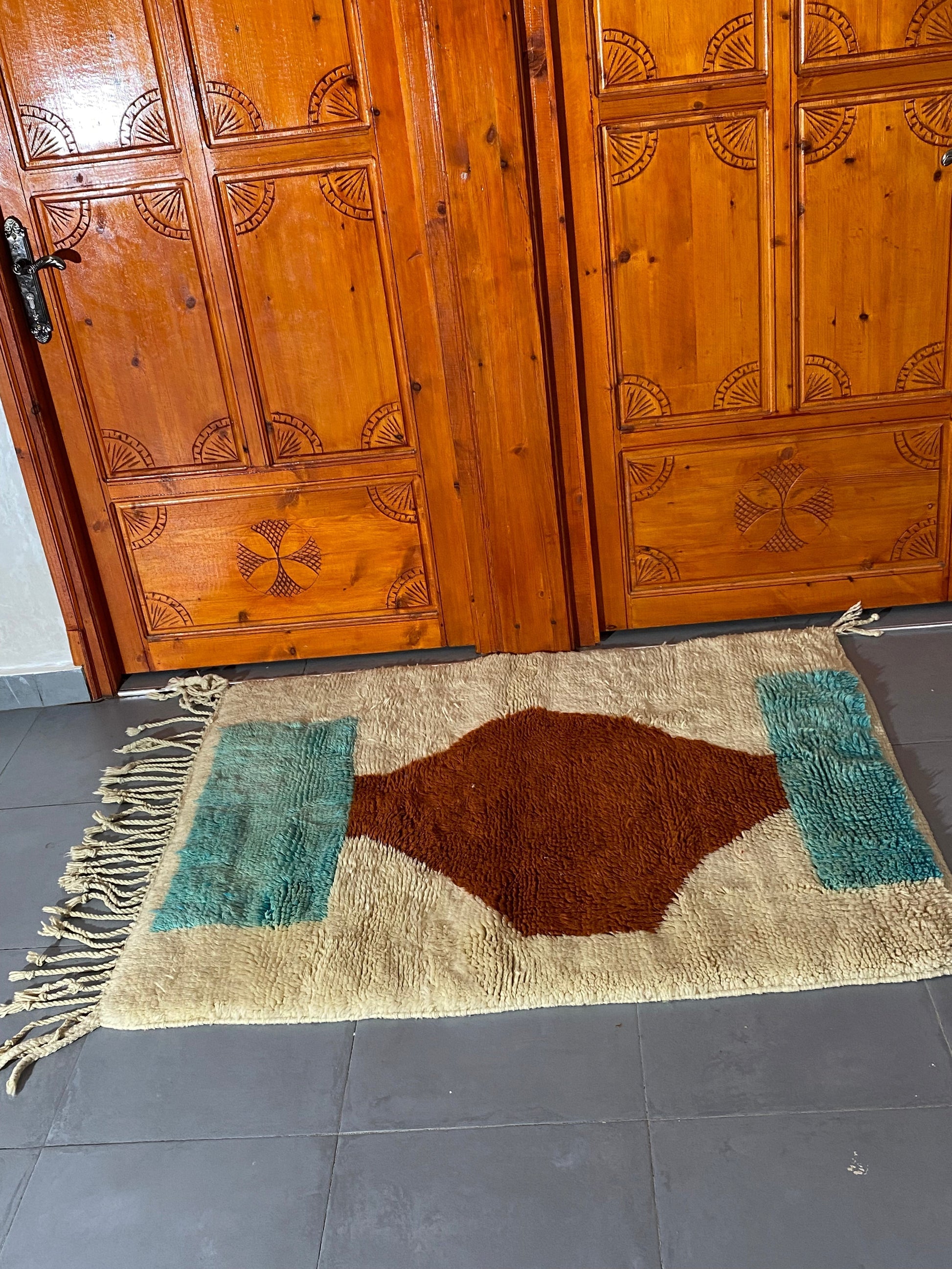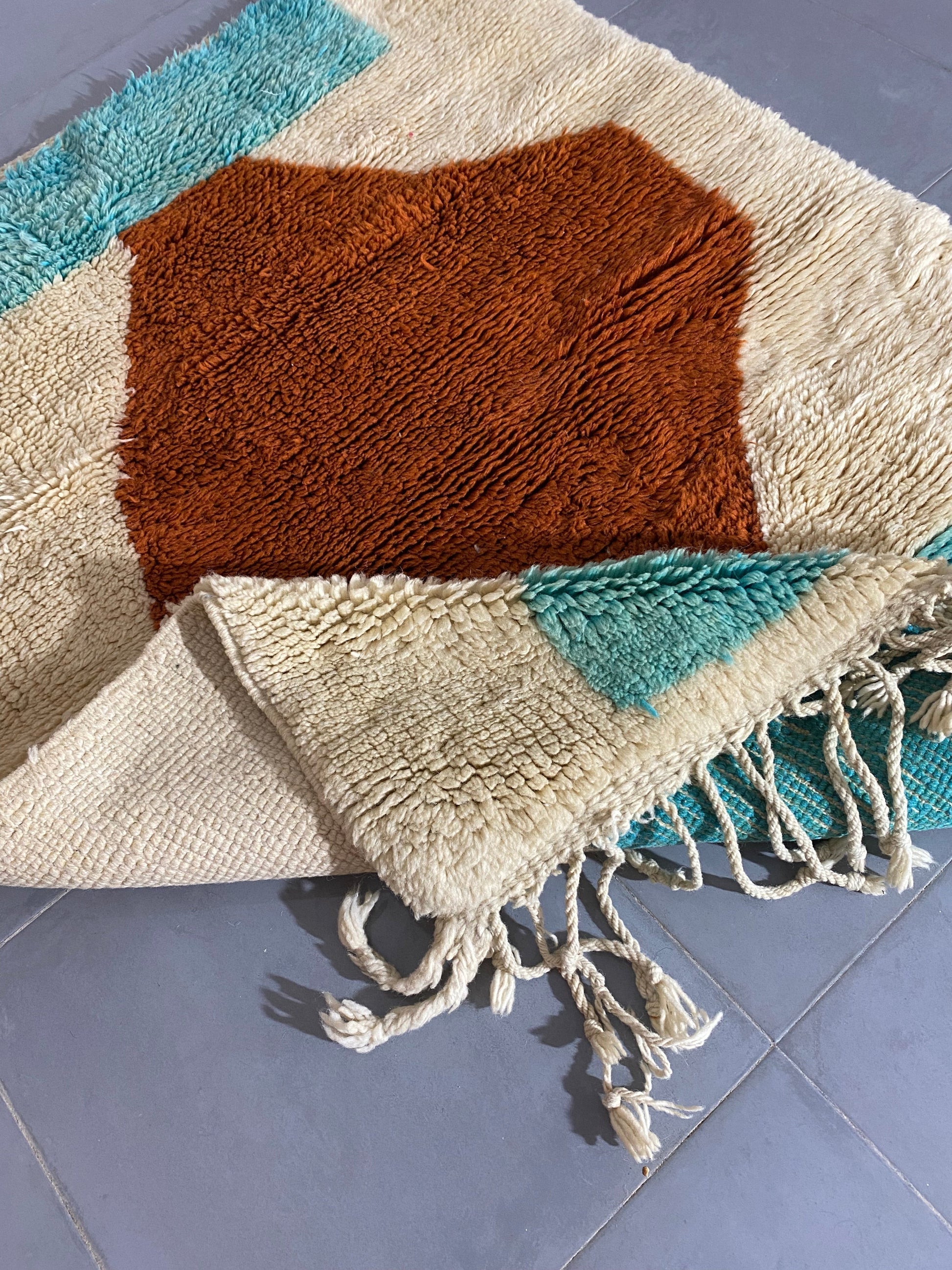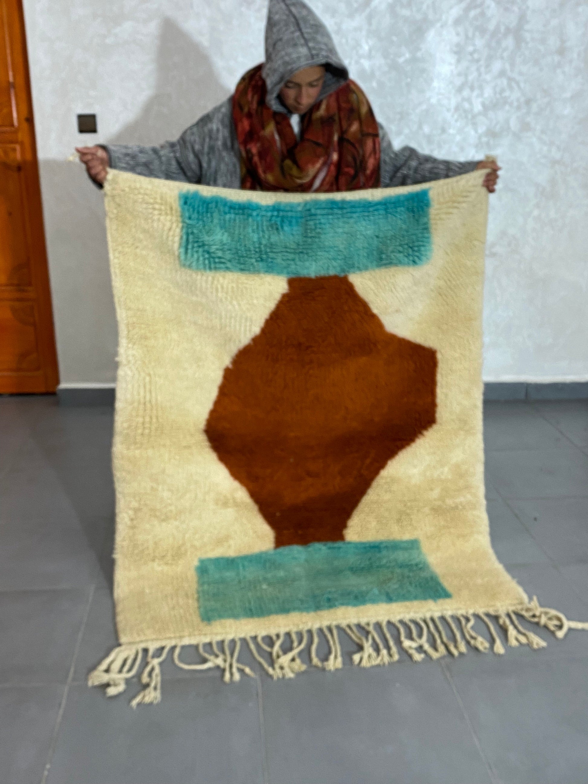This Beni ourain rug is a Moroccan handmade rug, made between the middle Atlas and the Atlantic ocean of Morocco. Women in that region employed soft sheep wool and furnished it perfectly with wide diamonds shapes and tiny perfect details.